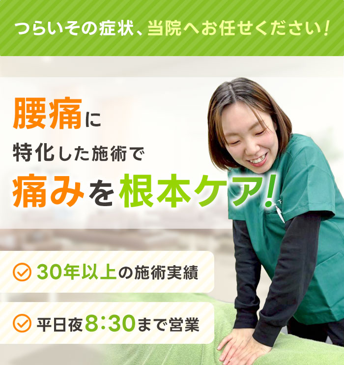 多様な治療メニューから一人ひとりに合わせた施術を行い、腰痛における悩みを改善させるだけでなく、再発リスク軽減のための根本改善や予防、アドバイスなど、症状に対する不安が解消されるまでサポートいたします。